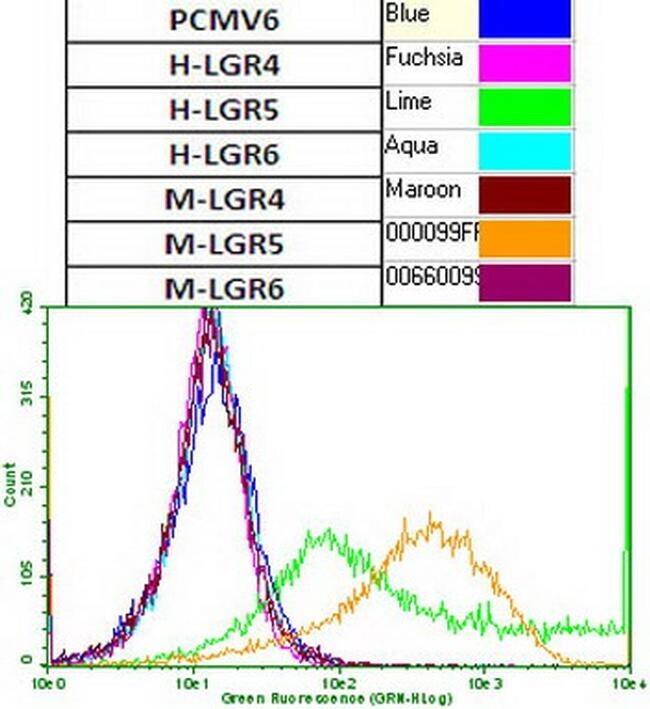 - Flow cytometric analysis of HEK293T cells transiently transfected with human LGR4 (RC221345) or mouse LGR4 (MR219497), human LGR5 (RC212825) or mouse LGR5 (MR219702), human LGR6 (RC219284) or mouse LGR6 (MR224646), or control vector pCMV6-Entry (PS100001), using anti-LGR5 antibody (UM800104, 1:100) surface stained on live cells.
