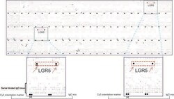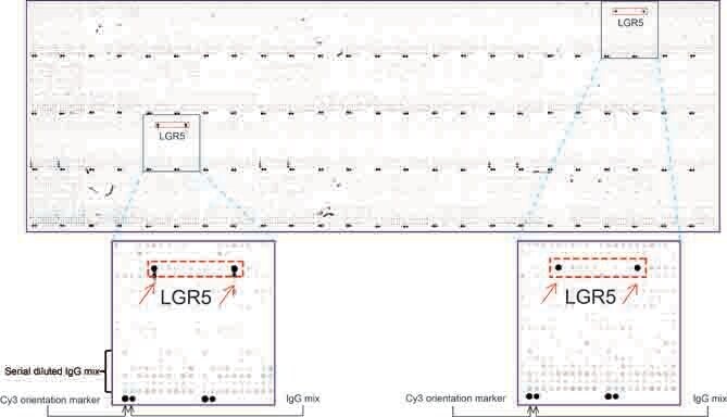 - OriGene overexpression protein microarray chip was immunostained with UltraMAB anti-LGR5 mouse monoclonal antibody (UM800104) at 1:100. The positive reactive proteins are highlighted with two red arrows in the enlarged subarray. All the positive controls spotted in this subarray are also labeled for clarification.