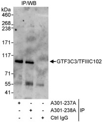 - Detection of human GTF3C3/TFIIIC102 by western blot of immunoprecipitates. Samples: Whole cell lysate (1 mg for IP, 20% of IP loaded) from HeLa cells. Antibodies: Affinity purified rabbit anti-GTF3C3/TFIIIC102 antibody A301-237A used for IP at 3 µg/mg lysate. GTF3C3/TFIIIC102 was also immunoprecipitated by rabbit anti-GTF3C3/TFIIIC102 antibody A301-238A, which recognizes a downstream epitope. For blotting immunoprecipitated GTF3C3/TFIIIC102, A301-238A was used at 1 µg/ml. Detection: Chemiluminescence with an exposure time of 3 minutes.