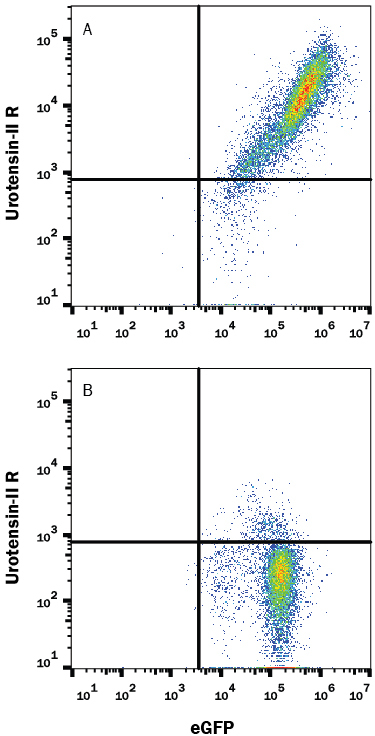 - Detection of Urotensin-II R in HEK293 Human Cell Line Transfected with Mouse Urotensin-II R and eGFP by Flow Cytometry. HEK293 human embryonic kidney cell line transfected with either (A) mouse Urotensin-II R or (B) irrelevant transfectants and eGFP was stained with 0.2 μg Rat Anti-Mouse Urotensin-II R Alexa Fluor® 647-conjugated Monoclonal Antibody (Catalog # FAB9245R). Quadrant markers were set based on control antibody staining (Catalog # IC013R). View our protocol for Staining Membrane-associated Proteins.