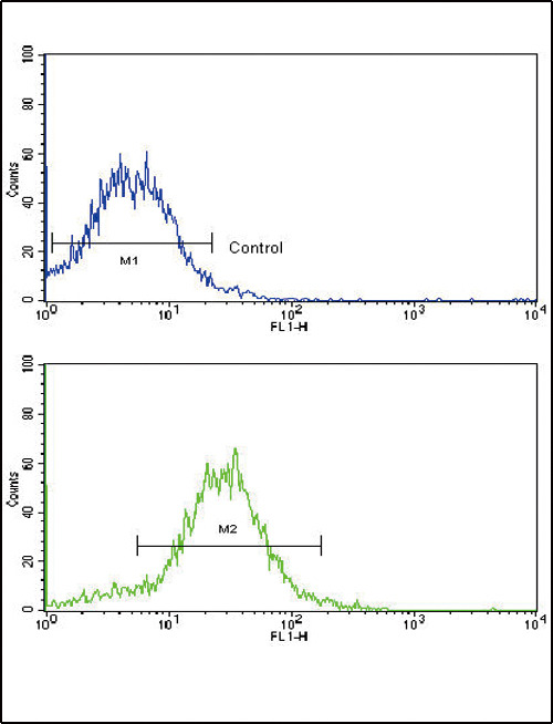 - Flow cytometric analysis of HepG2 cells using BMPR2 Antibody (N-term)(bottom histogram) compared to a negative control cell (top histogram). FITC-conjugated goat-anti-rabbit secondary antibodies were used for the analysis.