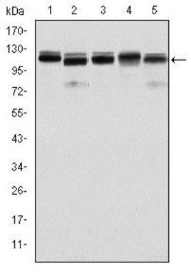 - Western Blot: BMPR-II Antibody (3F6) [NBP2-37624] - Analysis using BMPR2 mouse mAb against Hela (1), A431 (2), NIH/3T3 (3), Cos7 (4) and PC-12 (5) cell lysate.