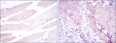 - Immunohistochemistry-Paraffin: BMPR-II Antibody (3F6) [NBP2-37624] - Muscle tissues (left) and kidney cancer tissues (right) using BMPR2 mouse mAb with DAB staining.