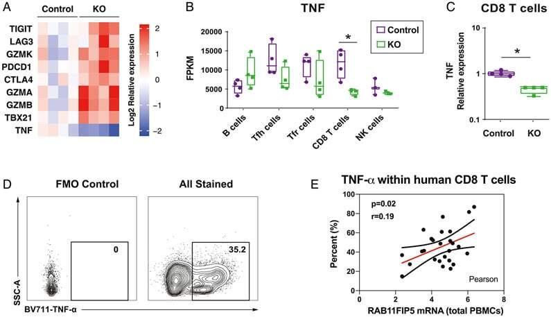 - FIGURE 4. Rab11Fip5 expression is associated with TNF-alpha production in CD8 + T cells. ( A ) Comparison of expression of genes encoding key immune checkpoints, cytokines, and cytotoxic proteases in CD8 + T cells from immunized RAB11FIP5 -/- mice and immunized control mice, shown as a heat map. TIGIT, LAG3, CTLA4 , and PDCD1 are the genes encoding immune checkpoint markers TIGIT, LAG-3, CTLA-4, and PD-1, respectively. TBX21 is the gene encoding T-Box Transcription Factor 21 (TBX21), also known as T-bet. GZMA, GZMB , and GZMK represent genes encoding granzyme A, B, and K. TNF is the gene encoding the cytokine TNF-alpha. ( B and C ) TNF expression in different cell types from immunized RAB11FIP5 -/- mice or control RAB11FIP5 fl/fl mice shown as fragments per kb of transcript per million mapped reads (FPKM) (B) and relative expression as determined by qPCR in CD8 + T cells (C). ( D and E ) TNF-alpha production by CD8 + T cells correlates with RAB11FIP5 mRNA expression in human PBMC. PBMC from 26 subjects were activated with anti-CD3/CD28 Abs for 3 d and then stimulated with PMA + ionomycin for 5 h before intracellular staining for TNF-alpha. (D) Representative example of intracellular staining for TNF-alpha (gated on CD3 + CD4 - T cells); the TNF-alpha + subset was defined based on a fluorescence minus one control. (E) Pearson analysis of the correlation between the percentage of TNF-alpha + cells within CD8 T cells and RAB11FIP5 mRNA expression in PBMC ( n = 26). Each dot repr