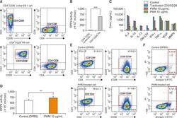 - Fig. 1 Characterization of CD26 expression, mDPP4 enzymatic activity, and cytokine expression in T helper cell lines. (A, B) Jurkat E6 and H9 Th1 cells were harvested and analyzed for the expression of T cell-specific surface markers, including CD3, CD4, and CD26 (A), and for their mDPP4 enzymatic activity (B). (C) H9 Th1 cells were treated with various T cell activators, including T-Activator CD3/CD28, PWM (10 ug/mL), and PMA (10 ug/mL) for 3 h. The expressions of 18 cytokines and 6 MMPs were measured in the culture supernatants of treated cells using two different panels of fluorescent multiplex bead assays. Activated T helper cell-specific cytokines, including IL-2, IL-10, IL-13, GM-CSF, IFN-gamma, and TNF-alpha, are shown. VEGF and MMP 9 are also included as detected high in all the samples. (D-F) H9 Th1 cells were treated with 10 ug/mL PWM for 12 h and subjected to mDPP4 enzymatic assays (D), FACS analysis for T helper cell-specific surface markers such as CD3, CD4, CD26, and CD28 (E), and analysis for apoptosis using an annexin V kit and flow cytometry (F). All analyses were repeated in three independent batches, and the data are shown as the means and standard deviation. ** p