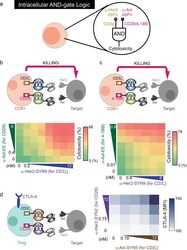 - Fig. 3 The intracellular AND logic with different signaling domains. a Diagram of intracellular AND logic. b Primary human CD8+ T cells were transduced with FOS zipCAR-containing CD3zeta domain and RR zipCAR-containing CD28 domain. Cytotoxicity against Her2- and Axl-expressing Nalm6 was measured 24 h after adding alpha-Her2-SYN9 and/or alpha-Axl-EE zipFvs. The heatmap indicates cytotoxicity at varying zipFv concentrations ( n = 3, data are represented as mean). c Cytotoxicity of CD8+ T cells transduced with FOS zipCAR-containing CD3zeta domain and RR zipCAR-containing 4-1BB domain. The heatmap indicates cytotoxicity at varying zipFv concentrations ( n = 3, data are represented as mean). d (Left) Isolated Treg cells were transduced with two zipCAR constructs: SYN6-CD3zeta-P2A-FOXP3 and SYN1-CD28-P2A-puro. After puromycin selection (2 mug/mL), Treg cells were co-cultured with Her2- and Axl-expressing Nalm6 target cells (Right) The heatmap shows surface CTLA-4 expression detected after 48 h by flow cytometry at varying zipFv concentrations (alpha-Axl-SYN5 and alpha-Her2-SYN2) ( n = 3, data are represented as mean).