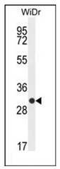 - Western blot analysis of CD152 / CTLA4 Antibody (N-term) Cat.-No AP52146PU-N in WiDr cell line lysates (35ug/lane).