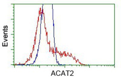 - Flow Cytometry: ACAT2 Antibody (3E2) [NBP2-02588] - HEK293T cells transfected with either overexpression plasmid (Red) or empty vector control plasmid (Blue) were immunostained by anti-ACAT2 antibody, and then analyzed by flow cytometry.