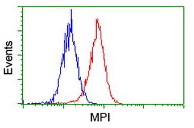 - Flow cytometric analysis of Hela cells, using anti-MPI antibody (TA504772), (Red), compared to a nonspecific negative control antibody, (Blue).
