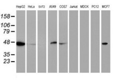 - Western blot analysis of extracts (35 µg) from 9 different cell lines by using anti-C20orf3 monoclonal antibody.