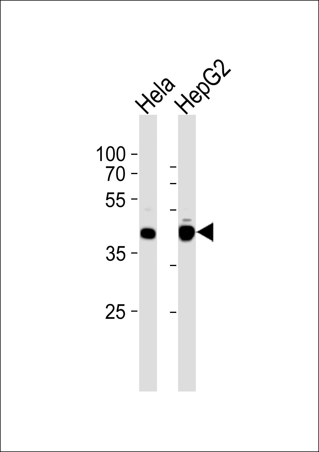 - "Western blot analysis of lysates from Hela,HepG2 cell line (from left to right), using 1:1000(WB, IF/ICC ). WB, IF/ICC was diluted at 1:1000 at each lane. A goat anti-rabbit IgG H&L(HRP) at 1:10000 dilution was used as the secondary antibody.Lysates at 20ug per lane."