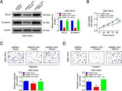 - Figure 5. MNX1-AS1 inhibited LSCC cell viability, migration and invasion via inhibiting BCL9/beta-catenin signaling. AMC-HN-8 cells in shRNA+vector group, shMNX1-AS1+vector group and shMNX1-AS1+BCL9 groups were submitted to the following assays. (A) Western blotting technology used for the detection of BCL9 and beta-catenin expression levels ( n = 3, ** P < 0.01, compared with shRNA+vector group; ## P < 0.01, compared with shMNX1-AS1+vector group). (B) MTT assay for cell viability detection ( n = 3, ** P < 0.01, compared with shRNA+vector group). (C, D) Transwell chambers used for cell migration and invasion detection ( n = 3, ** P < 0.01, compared with shRNA+vector group; ## P < 0.01, compared with shMNX1-AS1+vector group). LSCC: laryngeal squamous cell carcinoma.