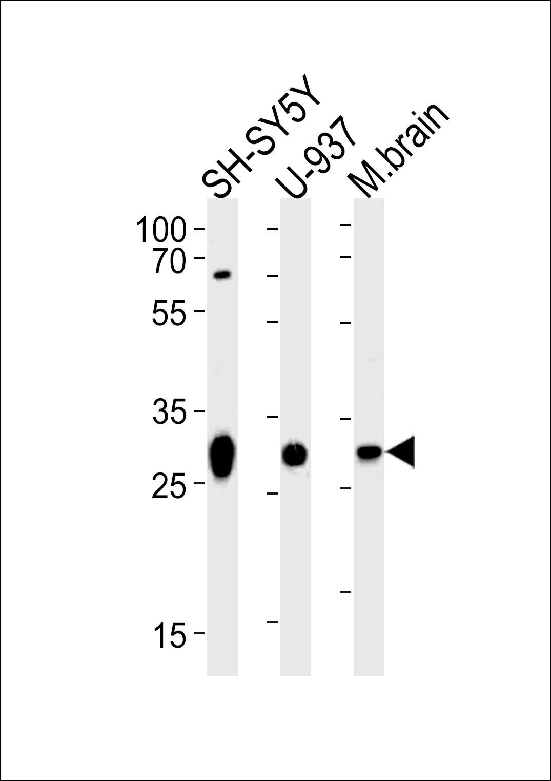 - Western Blot analysis of ANP32E using the ANP32E Polyclonal Antibody (Product # PA5-116341) at a dilution of 1:1,000 in SH-SY5Y, U-937 cell line and mouse brain tissue (from left to right) (35 µg per lane). A goat anti-rabbit IgG H&L(HRP) at 1:5000 dilution was used as the secondary antibody.