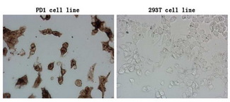 - Immunocytochemistry staining of stable expression PD1 cells using anti-PDCD1 mouse monoclonal antibody. (Left). The rihgt is negative control. (1:900)