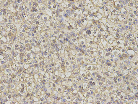 - Immunohistochemistry of paraffin-embedded human kidney cancer using S100A11 antibody at dilution of 1:200 (400x lens).