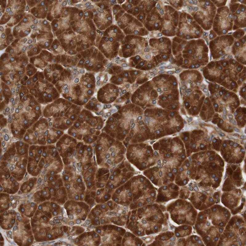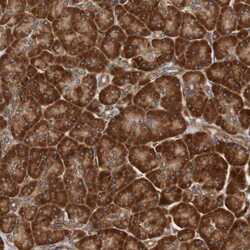 - Immunohistochemical analysis of TMEM109 in human pancreas using TMEM109 Polyclonal Antibody (Product # PA5-52857) shows strong cytoplasmic positivity in exocrine glandular cells.