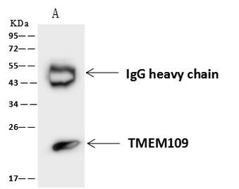- Immunoprecipitation of TMEM109 was performed on (Lane A) 0.5 mg U-251MG whole cell lysate using 4 µL of TMEM109 Polyclonal Antibody (Product # PA5-112198) at a dilution of 1:100, and 60 µg of Immunomagnetic beads Protein A/G. A Goat Anti-Rabbit IgG (H+L)/HRP was used as a secondary antibody at a dilution of 1:10,000. Developed using the ECL technique and performed under reducing conditions. Predicted band size: 20 kDa. Observed band size: 20 kDa.