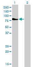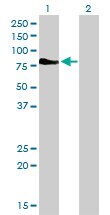 - Western Blot analysis of DMPK expression in transfected 293T cell line by DMPK monoclonal antibody (M01), clone 2F7.Lane 1: DMPK transfected lysate(69.4 KDa).Lane 2: Non-transfected lysate.