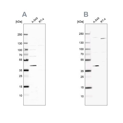 - Western Blot: GALK1 Antibody [NBP1-81854] - Analysis in human cell line RT-4 and human cell line U-251 MG.