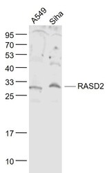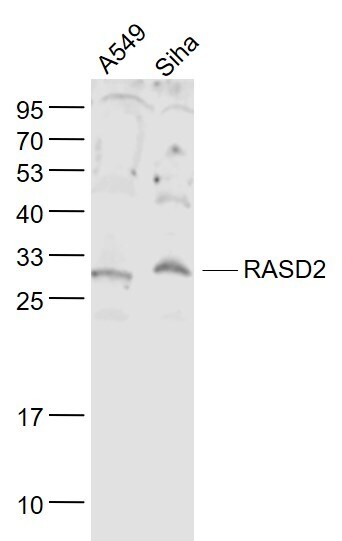 - Lane 1: A549 cell lysates; Lane 2: Siha cell lysates probed with RASD2 Polyclonal Antibody, Unconjugated (bs-7006R) at 1:1000 dilution and 4°C overnight incubation. Followed by conjugated secondary antibody incubation at 1:20000 for 60 min at 37°C.