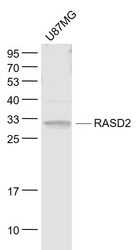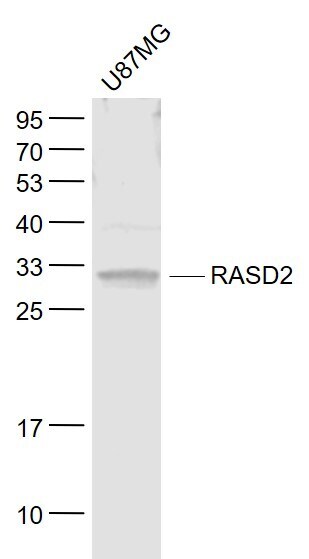 - Human U87MG cell lysates probed with RASD2 Polyclonal Antibody, Unconjugated (bs-7006R) at 1:1000 dilution and 4°C overnight incubation. Followed by conjugated secondary antibody incubation at 1:20000 for 60 min at 37°C.