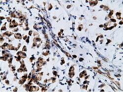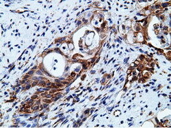 - IHC of paraffin-embedded Carcinoma of Human pancreas tissue using anti-KHK mouse monoclonal antibody.