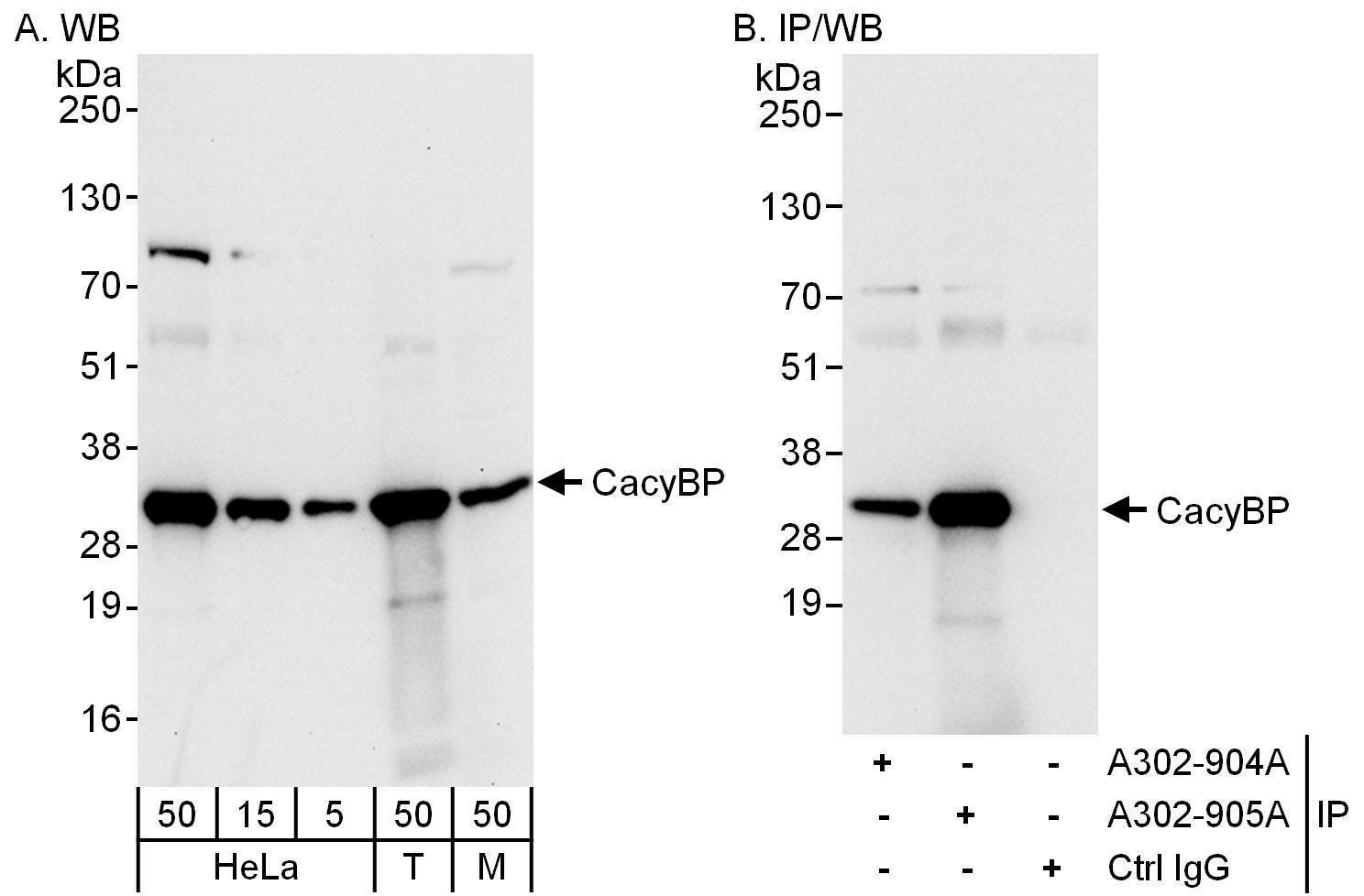 - Detection of human and mouse CacyBP by western blot (h&m) and immunoprecipitation (h). Samples: Whole cell lysate from HeLa (5, 15 and 50 µg for WB; 1 mg for IP, 20% of IP loaded), 293T (T; 50 µg) and mouse NIH3T3 (M; 50 µg) cells. Antibodies: Affinity purified rabbit anti-CacyBP antibody A302-905A used for WB at 0.04 µg/ml (A) and 0.4 µg/ml (B) and used for IP at 3 µg/mg lysate. CacyBP was also immunoprecipitated by rabbit anti-CacyBP antibody A302-904A, which recognizes an upstream epitope. Detection: Chemiluminescence with exposure times of 10 seconds (A) and 3 seconds (B).
