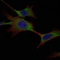 - Immunofluorescence analysis of NIH/3T3 cells using HK1 monoclonal antibody (Product # MA5-15680) (Green). Blue: DRAQ5 fluorescent DNA dye. Red: actin filaments have been labeled with phalloidin.