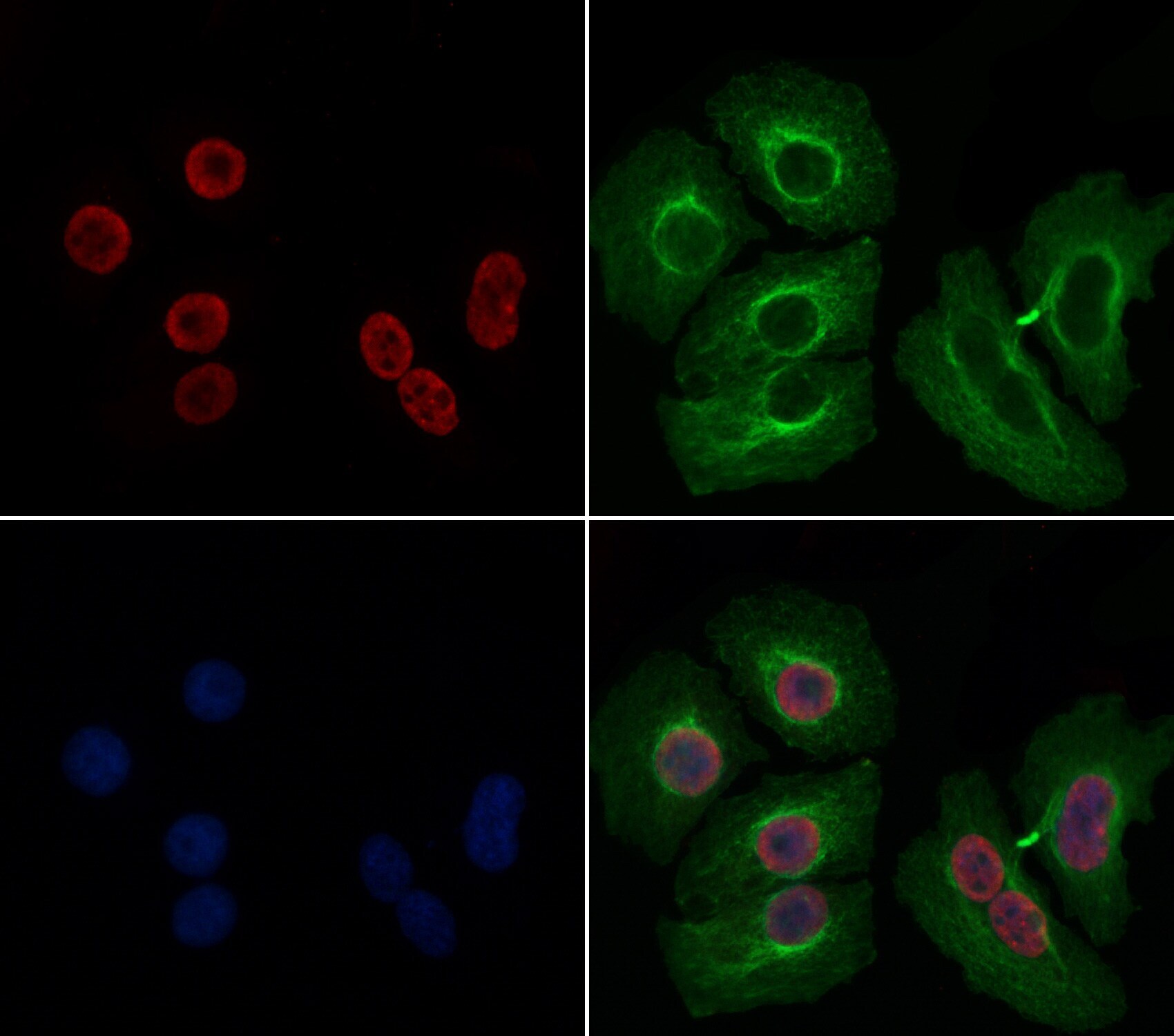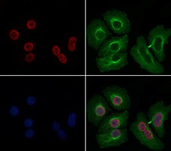 - Immunocytochemical analysis of CRP1 in Hela cells using a CRP1 polyclonal antibody (Product # PA5-118824). The samples were fixed with PFA and permeabilized in 0.1% Triton X-100,then blocked in 10% serum for 45 minutes at 25°C. Samples were then incubated with the primary antibody and mouse anti-beta tubulin antibody at a dilution of 1:200 for 1 hour at 37°C. An AlexaFluor594 conjugated goat anti-rabbit IgG(H+L) Ab(Red) and an AlexaFluor488 conjugated goat anti-mouse IgG(H+L) Ab(Green) were used as the secondary antibody. The nuclear counter stain is DAPI(blue).