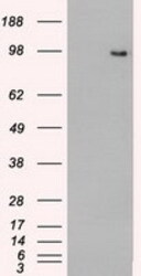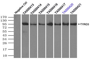 - HEK293T cells were transfected with the pCMV6-ENTRY control (Left lane) or pCMV6-ENTRY TYRO3 (Right lane) cDNA for 48 hrs and lysed. Equivalent amounts of cell lysates (5 ug per lane) were separated by SDS-PAGE and immunoblotted with anti-TYRO3.