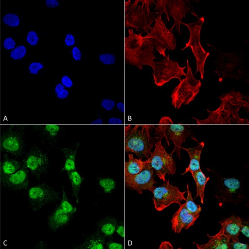 - Immunocytochemistry/Immunofluorescence analysis using Rabbit Anti-Adenosine receptor A1 Polyclonal Antibody. Tissue: Neuroblastoma cell line (SK-N-BE). Species: Human. Fixation: 4% Formaldehyde for 15 min at RT. Primary Antibody: Rabbit Anti-Adenosine receptor A1 Polyclonal Antibody at 1:100 for 60 min at RT. Secondary Antibody: Goat Anti-Rabbit ATTO 488 at 1:200 for 60 min at RT. Counterstain: Phalloidin Texas Red F-Actin stain; DAPI (blue) nuclear stain at 1:1000, 1:5000 for 60 min at RT, 5 min at RT. Localization: Cell Membrane, Multi-Pass Membrane Protein. Magnification: 60X. (A) DAPI (blue) nuclear stain (B) Phalloidin Texas Red F-Actin stain (C) Adenosine receptor A1 Antibody (D) Composite.