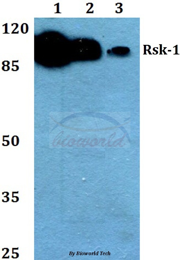 - Western blot (WB) analysis of Rsk-1 (T353) pAb at 1:500 dilutionLane1:THP-1 whole cell lysateLane2:sp2/0 whole cell lysateLane3:H9C2 whole cell lysate