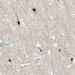 - Immunohistochemical staining of human cerebral cortex shows strong nuclear positivity in neuronal cells.