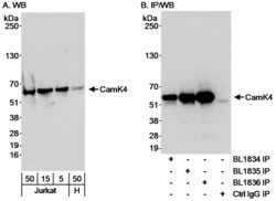 - Detection of human CamK4 by western blot and immunoprecipitation. Samples: A) Whole cell lysate from Jurkat (5, 15 and 50 µg) and HeLa (50 µg) cells. B) Whole cell lysate (1 mg/IP; 1/4 of IP loaded/lane) from Jurkat cells. Antibodies: Affinity purified rabbit anti-CamK4 antibody BL1836 (Cat. No. A300-494A) used at 0.04 µg/ml for WB (A and B) and at 3 µg/mg lysate for IP (B). CamK4 was also immunoprecipitated using CamK4 antibodies BL1834 (Cat. No. A300-492A) and BL1835 (Cat. No. A300-493A) used at 3 µg/mg lysate for IP. Detection: Chemiluminescence with an exposure time of 30 seconds.