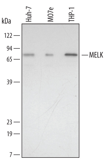 - Detection of Human MELK by Western Blot. Western blot shows lysates of Huh-7 human hepatoma cell line, MO7e human megakaryocytic leukemic cell line, and THP-1 human acute monocytic leukemia cell line. PVDF membrane was probed with 1 µg/mL of Sheep Anti-Human MELK Antigen Affinity-purified Polyclonal Antibody (Catalog # AF4820) followed by HRP-conjugated Anti-Sheep IgG Secondary Antibody (Catalog # HAF016). A specific band was detected for MELK at approximately 74 kDa (as indicated). This experiment was conducted under reducing conditions and using Immunoblot Buffer Group 1.