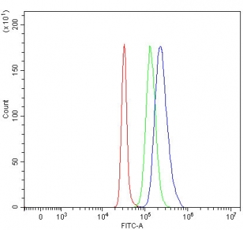 - Flow cytometry testing of fixed and permeabilized human SH-SY5Y cells with PRMT6 antibody at 1ug/million cells (blocked with goat sera); Red=cells alone, Green=isotype control, Blue= PRMT6 antibody.