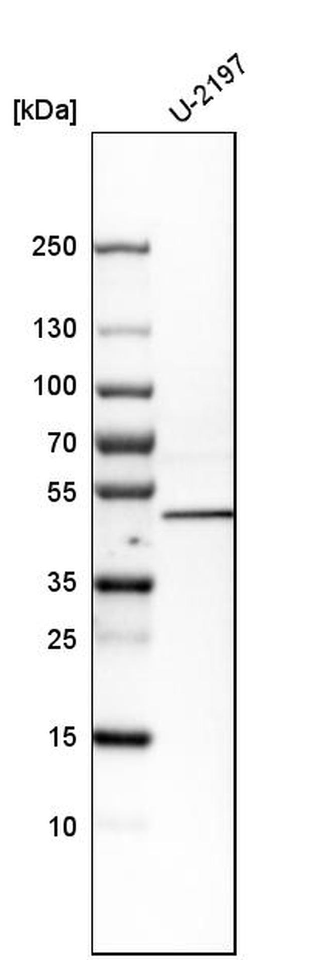 - Western blot analysis of SQRDL in human cell line U-2197 using a SQRDL Polyclonal Antibody (Product # PA5-53549).