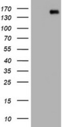 - HEK293T cells were transfected with the pCMV6-ENTRY control (Left lane) or pCMV6-ENTRY PCDH7 (RC223033, Right lane) cDNA for 48 hrs and lysed. Equivalent amounts of cell lysates (5 ug per lane) were separated by SDS-PAGE and immunoblotted with anti-PCDH7.