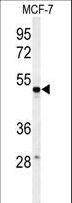 - Western blot of PSG7 Antibody in MCF-7 cell line lysates (35 ug/lane). PSG7 (arrow) was detected using the purified antibody.