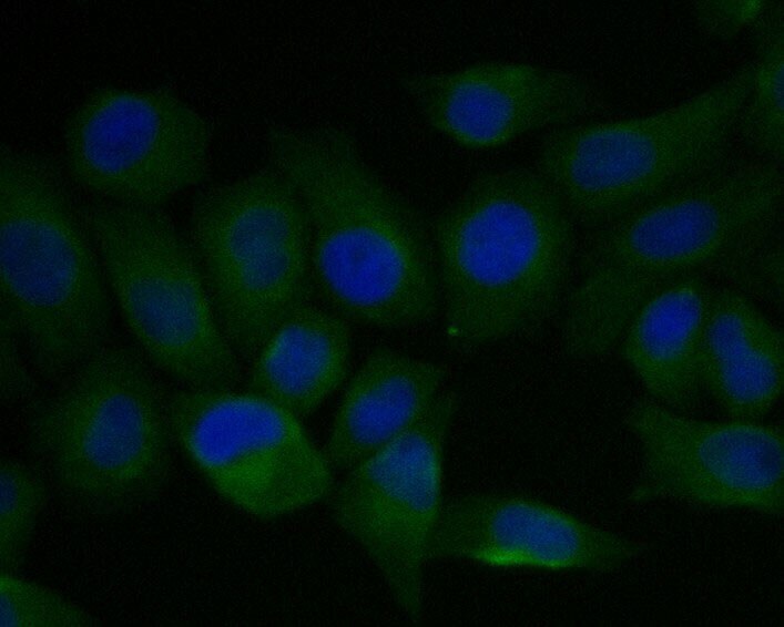 - Immunocytochemistry-Immunofluorescence analysis of of FADS1 in Hela cells (green). Formalin fixed cells were permeabilized with 0.1% Triton X-100 in TBS for 10 minutes at room temperature and blocked with 1% Blocker BSA for 15 minutes at room temperature. Cells were probed with FADS1 Recombinant Monoclonal Antibody (Product # MA5-42500) at a dilution of 1:50 for 1 hour at room temperature, washed with PBS. Alexa Fluor 488 Goat anti-Rabbit IgG was used as the secondary antibody at 1:1,000 dilution. The nuclear counter stain is DAPI (blue).