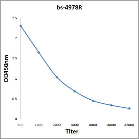 - Antigen: bs-4978P, 0.2ug/100ul Primary: Antiserum, 1:500, 1:1000, 1:2000, 1:4000, 1:8000, 1:16000, 1:32000; Secondary: HRP conjugated Goat-Anti-Rabbit IgG(bs-0295G-HRP) at 1:5000; TMB staining; Read the data in Microplate Reader by 450nm.