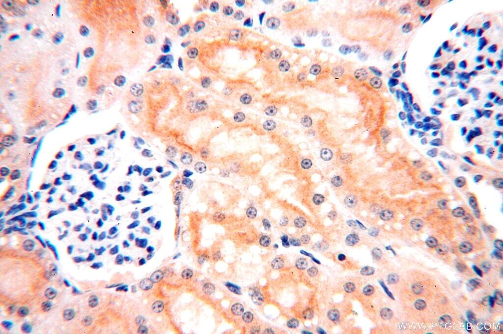 - Immunohistochemistry of paraffin-embedded human kidney using 18274-1-AP (ATP6V0D1 antibody) at dilution of 1:100 (under 40x lens).