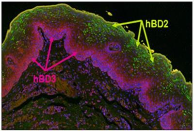 - Immunohistochemistry-Paraffin: beta-Defensin 3 Antibody [NB200-117] - Distribution of hBD-2 and hBD-3 in normal oral epithelium. Formalin fixed and parafilm embedded normal human oral tissue was labeled with an anti-hBD-2 specific primary antibody, and detected with an AF488 conjugated secondary antibody. hBD-3 was labeled with a rabbit anti-hBD-3 (Novus Biologicals Inc., Littleton, CO, USA), specific primary antibody and detected using an AF594 (purple) conjugated donkey anti-rabbit (Invitrogen). Note green fluorescence detection of hBD-2 localized to the stratum spinosum and stratum granulosum, while pink/red fluorescence detects hBD-3 exclusively to the stratum basale. hBD-1, not shown, is localized to the same regions as hBD-2. Image collected and cropped by CiteAb from the following publication (http://journal.frontiersin.org/article/10.3389/fimmu.2012.00294/abstract) licensed under a CC-BY licence.