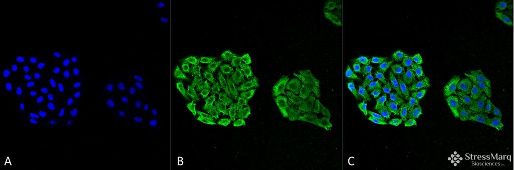 - Immunocytochemistry/Immunofluorescence analysis using human cervical cancer cells. Fixation involved 4% Formaldehyde for 15 min at RT. Samples were incubated with HSP70 monoclonal antibody (Product # MA5-45216) at 1:100 for 60 min at RT, followed by Goat Anti-Mouse ATTO 488 at 1:100 for 60 min at RT. Counterstain used was DAPI (blue) nuclear stain at 1:5,000 for 5 min RT. Localization: Cytoplasm. Magnification: 40X.