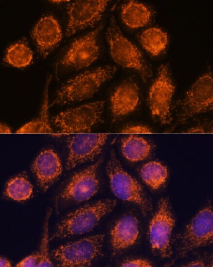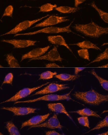 - Immunofluorescence analysis of Mtmr9 in HeLa cells. Samples were incubated with Mtmr9 Polyclonal antibody (Product # PA5-89003) using a dilution of 1:100. Blue: DAPI for nuclear staining.