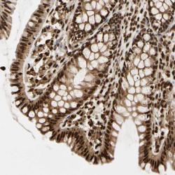 - Immunohistochemical staining of human colon shows strong nuclear positivity in glandular cells.