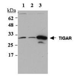 - Western Blot of endogenous and overexpressed TIGAR using PAb to TIGAR (AT122). Cell extracts from HEK 293 (lane 1), HEK 293T (lane 2) or HEK 293T transfected with a plasmid coding for human TIGAR (lane 3) were resolved by SDS-PAGE under reducing conditions, transferred to nitrocellulose and incubated with the PAb to TIGAR (AT122) at a 1:1000 dilution for 1 hour. Proteins were visualized using a peroxidase-conjugated PAb to rabbit IgG and a chemiluminescence detection system.