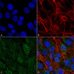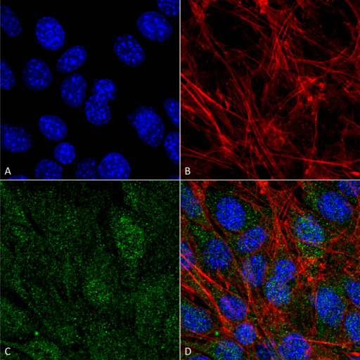 - Immunocytochemistry/Immunofluorescence analysis using Rabbit Anti-PI 3 Kinase Class 3 Polyclonal Antibody. Tissue: C2C12 Cells (Mouse Myoblast cell line). Species: Mouse. Fixation: 4% Formaldehyde for 15 min at RT. Primary Antibody: Rabbit Anti-PI 3 Kinase Class 3 Polyclonal Antibody at 1:100 for 60 min at RT. Secondary Antibody: Goat Anti-Rabbit ATTO 488 at 1:200 for 60 min at RT. Counterstain: Phalloidin Texas Red F-Actin stain; DAPI (blue) nuclear stain at 1:1000, 1:5000 for 60 min at RT, 5 min at RT. Localization: Midbody, Late Endosome, Cytoplasmic Vesicle, Autophagosome. Magnification: 60X. (A) DAPI (blue) nuclear stain (B) Phalloidin Texas Red F-Actin stain (C) PI 3 Kinase Class 3 antibody (D) Composite.