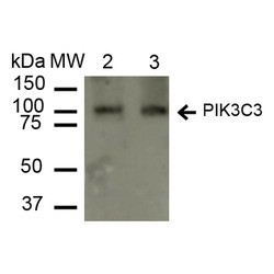 - Western blot analysis of Rat, Mouse Liver cell lysates showing detection of ~101.5 kDa PI 3 Kinase Class 3 protein using Rabbit Anti-PI 3 Kinase Class 3 Polyclonal Antibody. Lane 1: Molecular Weight Ladder (MW). Lane 2: Rat Liver cell lysates. Lane 3: Mouse Liver cell lysates. Load: 15 µg. Block: 5% Skim Milk in 1X TBST. Primary Antibody: Rabbit Anti-PI 3 Kinase Class 3 Polyclonal Antibody at 1:1000 for 2 hours at RT. Secondary Antibody: Goat Anti-Rabbit IgG: HRP at 1:2000 for 60 min at RT. Color Development: ECL solution for 6 min in RT. Predicted/Observed Size: ~101.5 kDa.
