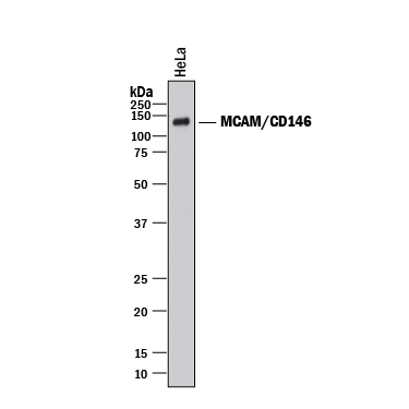 - Detection of Human MCAM/CD146 by Western Blot. Western blot shows lysate of HeLa human cervical epithelial carcinoma cell line. PVDF membrane was probed with 1 µg/mL of Mouse Anti-Human MCAM/CD146 Monoclonal Antibody (Catalog # MAB932) followed by HRP-conjugated Anti-Mouse IgG Secondary Antibody (Catalog # HAF018). A specific band was detected for MCAM/CD146 at approximately 140 kDa (as indicated). This experiment was conducted under reducing conditions and using Immunoblot Buffer Group 1.